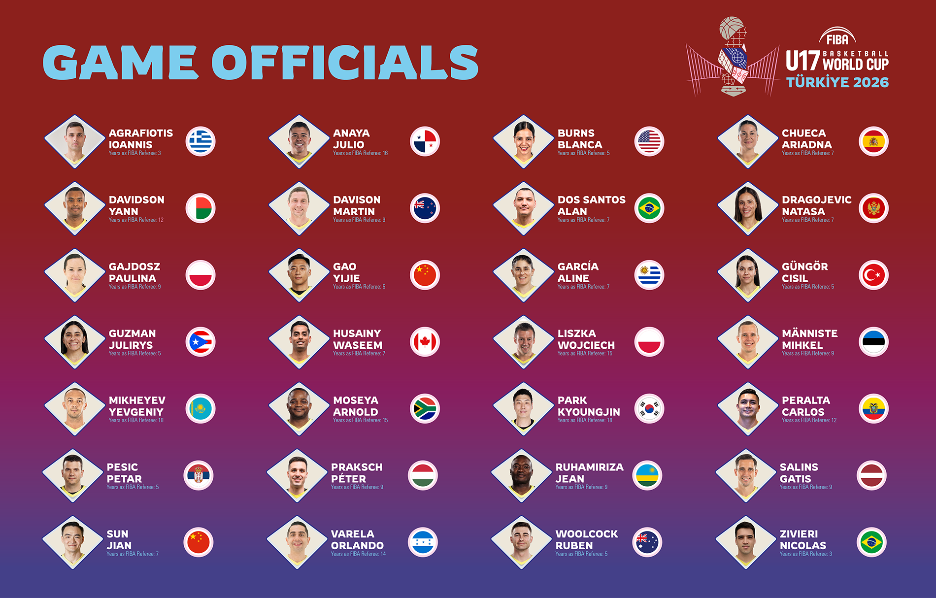 A diverse selection of 28 referees has been nominated to represent the global basketball community, covering all five FIBA regions: Africa, the Americas, Asia, Europe, and Oceania.