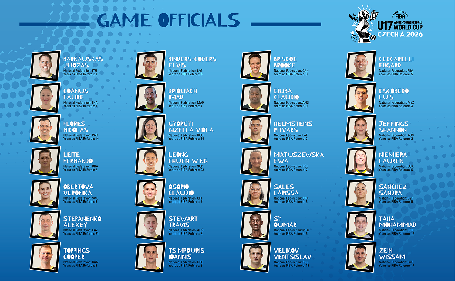 MIES (Switzerland) – FIBA has confirmed the list of referees nominated for the upcoming FIBA U17 Women's Basketball World Cup 2026, to be held in Brno, Czechia. A total of 28 referees representing all five FIBA regions have been selected for this prestigious youth event from July 11 to July 19. This selection follows an evaluation of international performance standards, including 10 female referees. The tournament will feature 16 participating countries, including the defending champions USA, who have won six of the previous seven editions, alongside hosts Czechia and representatives from every continent: Australia, Canada, Colombia, Côte d'Ivoire, Egypt, Germany, Italy, Japan, Latvia, Mexico, New Zealand, People's Republic of China, Slovenia, and Spain.